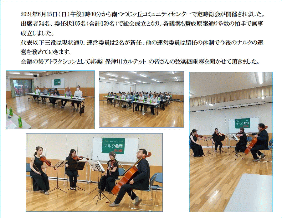 「フラワーアレンジメント」 「みずのき奉仕活動」 「誰でも歩ける会」 「日本銀行・島津資料館を訪ねて」 「第3回グルメの会」 「第1回ボーリング大会」 「特殊詐欺防止講座」 「第6回グラウンドゴルフ大会」 「第27回定時総会」